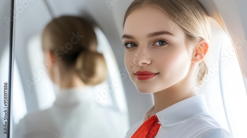 © MarkFinal, Fototapeta premium Air stewardess adjusting her uniform in front of a mirror before the flight, ensuring everything is perfectly in place