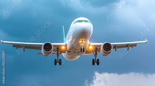 © Phirakhup, Fototapeta premium Airplane approaching landing against a dramatic cloudy sky.