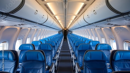 Fototapeta premium Airplane Cabin Interior with Blue Seats and Overhead Compartments