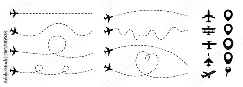 Obraz premium Airplane Dashed Flight Paths with Map Pins – Travel Route Vector
