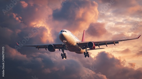 Obraz premium airplane descending sunset cloudscape