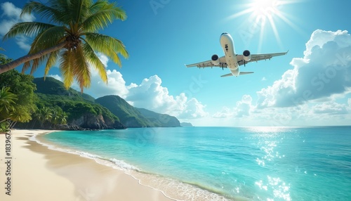 © Viktor, Obraz premium Airplane flies over beautiful tropical island beach and ocean. White sand shore, lush green mountains, clear turquoise water, palm trees sway in sunny sky.
