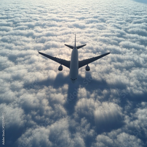 Fototapeta premium Airplane flying above clouds at sunrise with dramatic shadows
