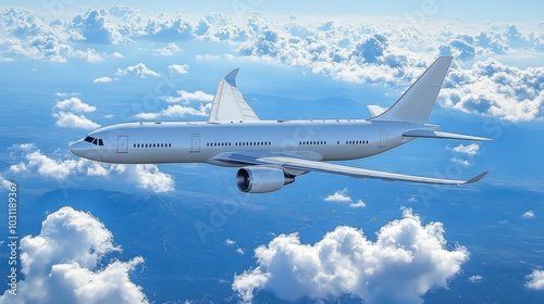 © reza, Fototapeta premium Airplane flying above clouds in a clear blue sky.