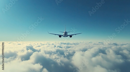 Fototapeta premium Airplane Flying Above Clouds in Clear Blue Sky