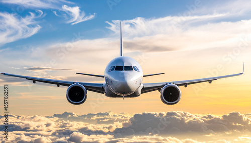 © TriBayuMakmur, Obraz premium Airplane Flying Against a Backdrop of Fluffy Clouds in Clear Blue Sky