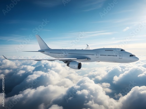 © ARgraphic, Obraz premium Airplane flying high above the clouds in a clear blue sky