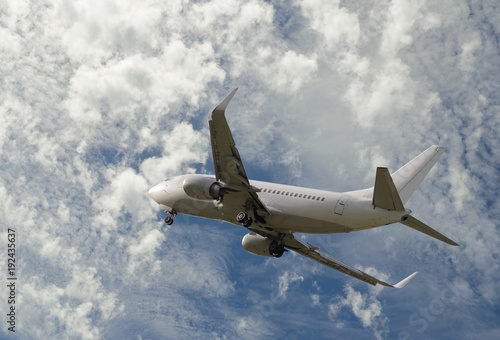 Obraz premium Airplane flying in sky with clouds at sunset time
