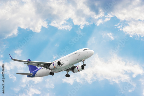 Fototapeta premium Airplane flying on blurred blue sky