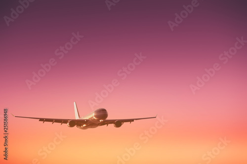 Fototapeta premium Airplane flying on sunset sky abstract background. Copy space of business...