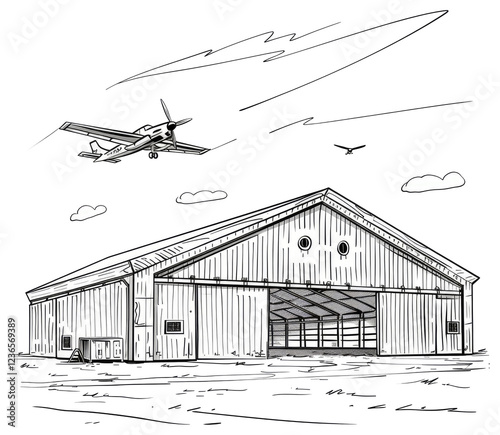 © NikahGeh, Fototapeta premium Airplane Flying Over a Large Hangar Building