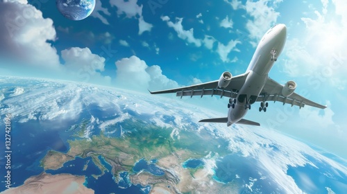 © LoomStock, Fototapeta premium Airplane flying over Earth. 3D illustration. Loading to the aircraft. Global Cargo Export Logistics Concept with Copy Space.