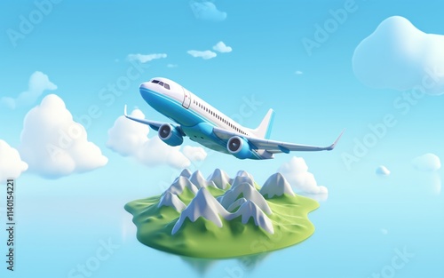 © SerPhoto, Obraz premium Airplane flying over ocean and a small island with mountains, blue sky.