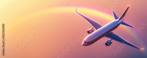 Fototapeta premium Airplane flying through a rainbow, symbolizing safe air travel, flight...