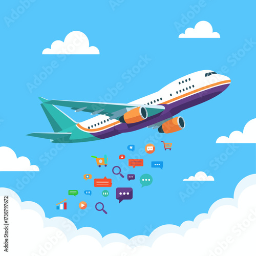 Fototapeta premium Airplane Flying Through Blue Sky with Clouds and Digital Icons