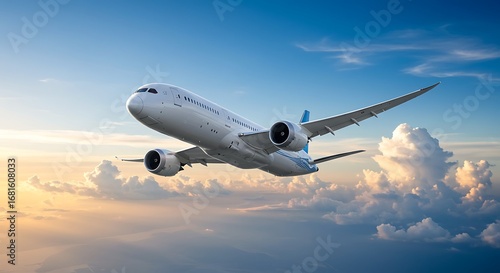 © Dira, Obraz premium Airplane flying through clouds at sunset.