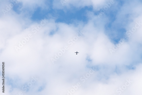 © AJ , Fototapeta premium Airplane flying through the sky in far distance passing through the clouds