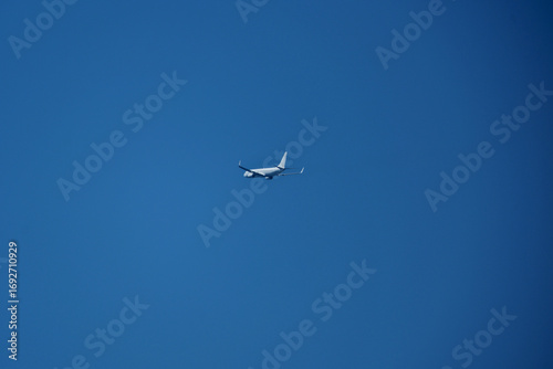 © Maksim Mikhailov, Fototapeta premium Airplane in the blue sky. A white plane flying in a cloudless blue sky.