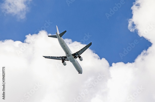 Fototapeta premium Airplane in the blue sky with clouds