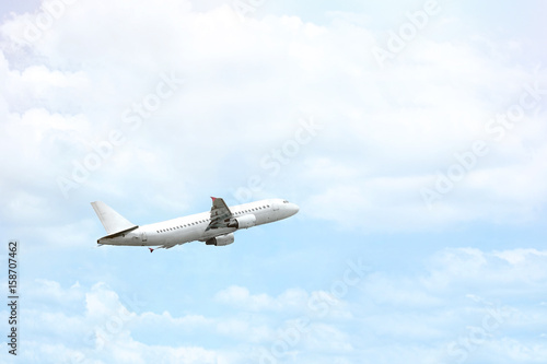 © Chaiphorn, Fototapeta premium Airplane is flying in a blue sky.