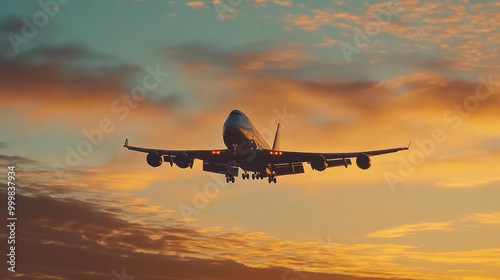 © Nicholas, Fototapeta premium Airplane Landing at Sunset