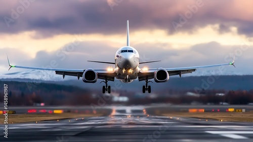 Fototapeta premium Airplane landing on runway at sunset, dramatic sky, front view, low angle...