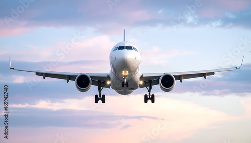 Obraz premium Airplane Landing Sunset Cloudscape.