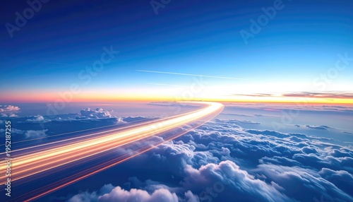 © JOYKO, Fototapeta premium Airplane Light Trails Over Clouds at Sunset.