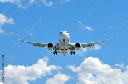 © nelsonpeng99, Fototapeta premium Airplane on blue sky white clouds