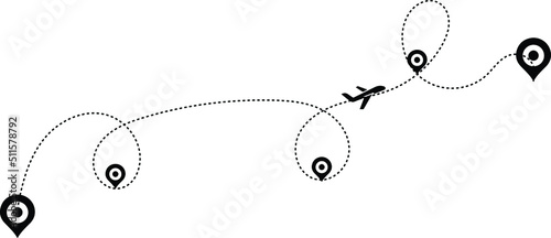 Fototapeta premium Airplane path in a dotted line. airplane and dash line trace. Travel and tourism concept. Aircraft tracking. location pins isolated