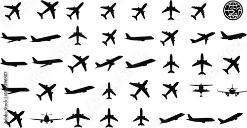 Naklejka premium Airplane Silhouette Vector Set, Aircraft Black Icons, Aviation Silhouettes,...
