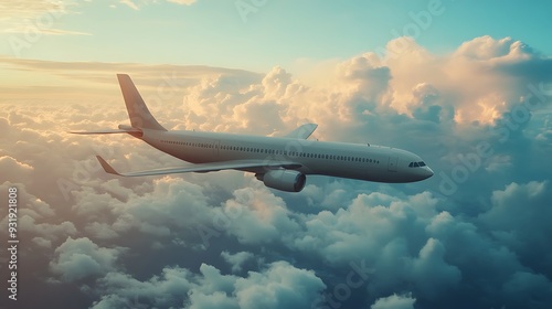 © Ariep, Fototapeta premium Airplane Soaring Above the Clouds at Sunset