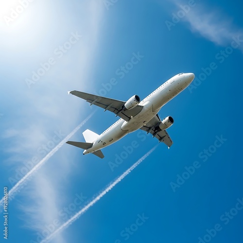 © Cinta, Fototapeta premium Airplane soaring through the blue sky with contrails.