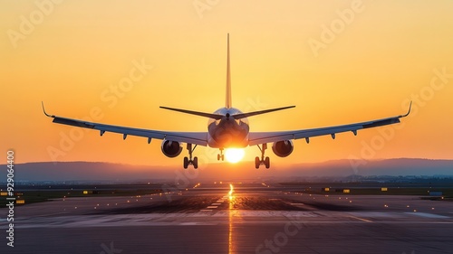 © Soulstarry , Obraz premium Airplane takeoff, sunrise burst, clear skies, tarmac in view