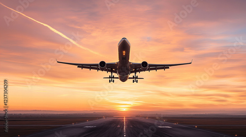 © Alexandra Adele, Fototapeta premium Airplane taking off against a vibrant sunset sky at the airport along the runway