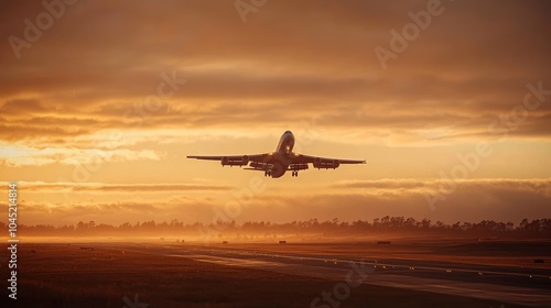 Fototapeta premium Airplane Taking Off at Sunrise with Golden Sky
