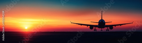 © Roman, Obraz premium Airplane taking off into the sunset with landing gear down, travel , space for text