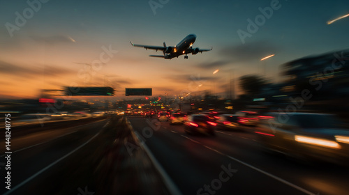 © Parol, Fototapeta premium Airplane taking off over a busy highway during sunset with traffic and city lights blurred