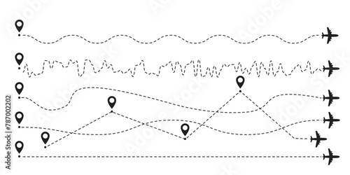 Fototapeta premium Airplane Track, Plane Path, Aircraft Tracking, Flight Trace, Plane Track to Point, Line Way, Air Lines Collection, Vector Illustration