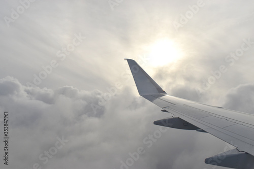 Obraz premium Airplane wing fying above white clouds obscure light from the sun