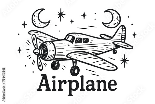 Obraz premium Airplane with Moons. Hand-drawn airplane with moons, propellers, and sparks, center word “Airplane” in black and white isolated