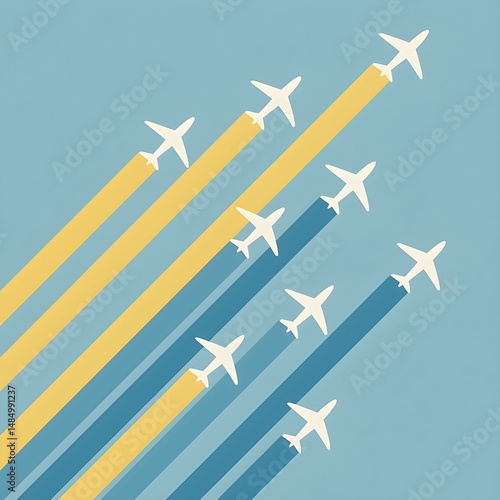 © Mirala, Fototapeta premium Airplanes flying across the sky with colorful trails creating a visually striking pattern during daylight hours