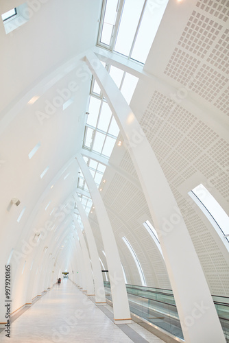 © SteenoWac/peopleimages.com, Naklejka premium Airport, corridor and architecture in tunnel with pillar, design and empty walkway from low angle with skylight. Hallway, beams and wall in atrium with conveyor belt for luggage, transport and travel
