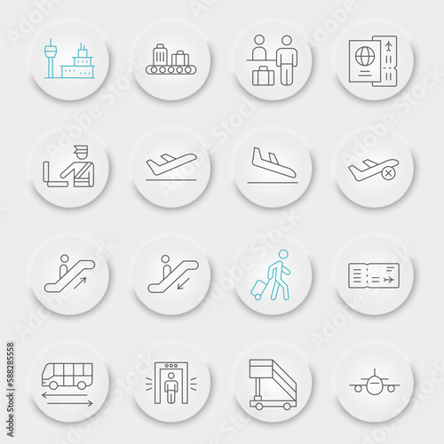 Fototapeta premium Airport line icon set, travel collection, vector graphics, neumorphic UI UX buttons, airport vector icons, terminal signs, outline pictograms, editable stroke