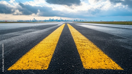 Naklejka premium Airport Runway Leading To City Skyline