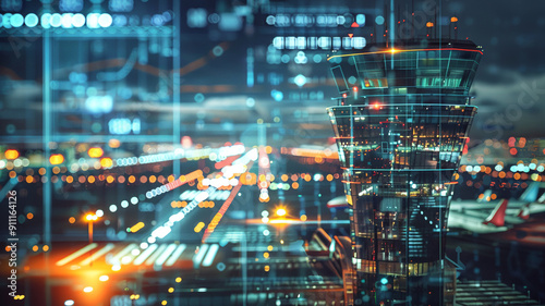 © Hanna, Fototapeta premium Airport Runway with Control Tower and Vibrant Light Trails