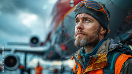 Fototapeta premium Airport technician refueling the plane, outdoors area of airport