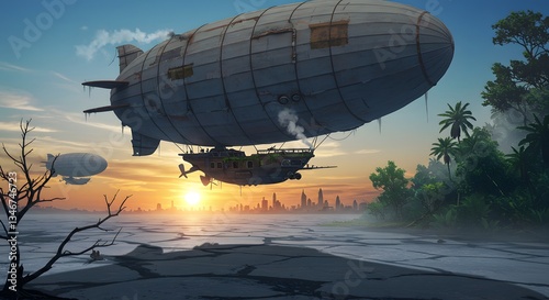 Obraz premium Airship Flying Over Sunset Landscape with City Silhouette and Tropical Elements