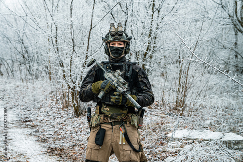 © Bohdan Petrushko, Fototapeta premium Airsoft man in black camouflage uniform and short machinegun with optical sight. Soldier in the winter forest. Horizontal photo front view.