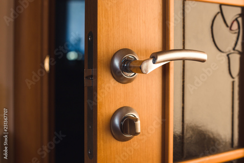 Obraz premium Ajar wooden interior door in the morning light